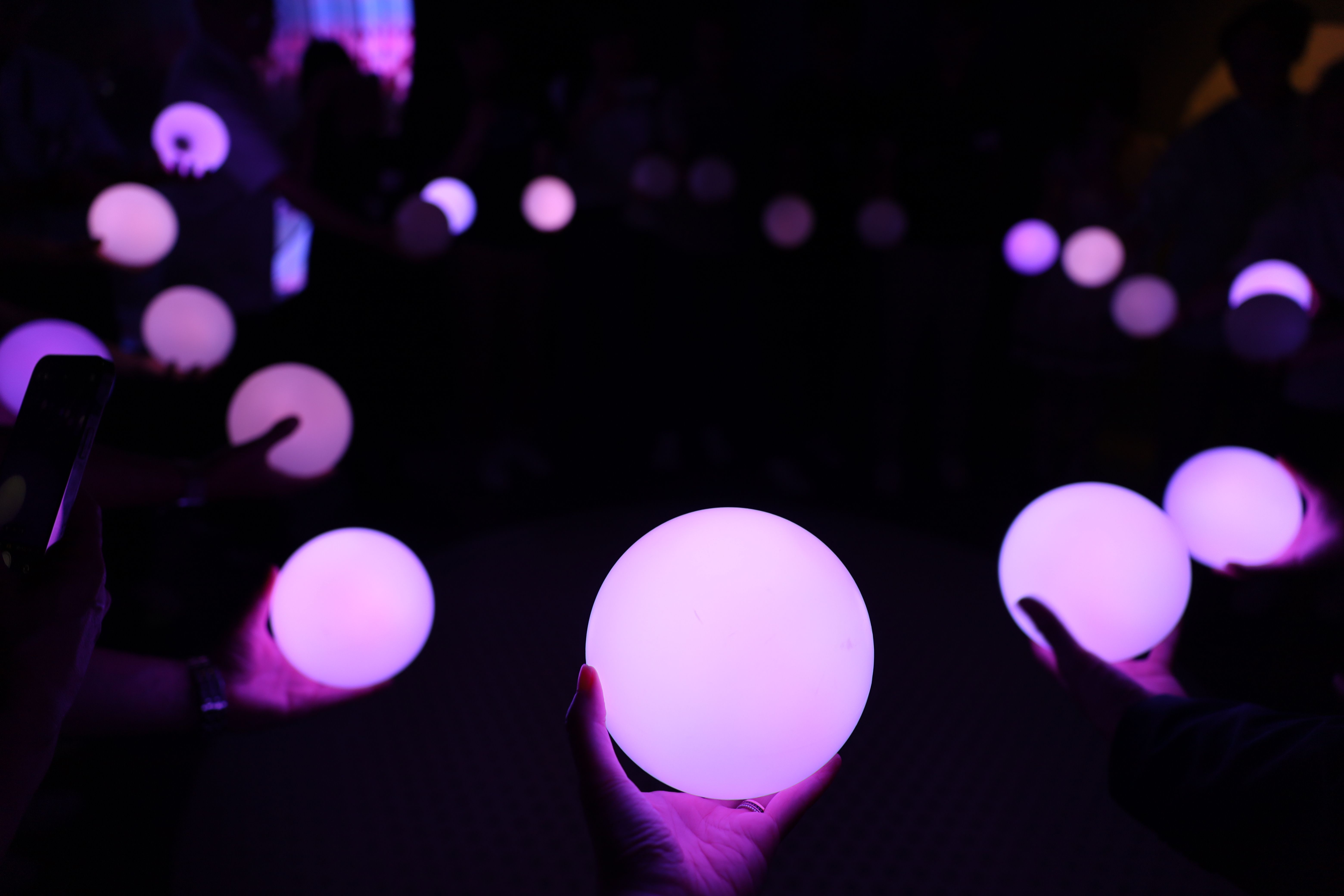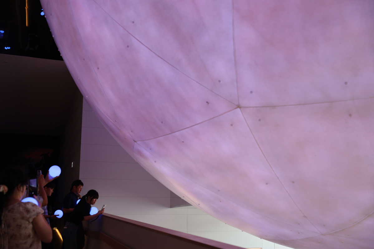「当初のイメージをそのまま実現するのは簡単ではありませんでしたが、調整を重ねることでデザインと施工の両立を図ることができました」と、山下工事部長は振り返ります。 施工段階では、地盤が軟弱で通常の基礎工事が難しいという条件に直面。淺沼組の土木部の知見を活かし、土木現場で多く用いられる「EPS工法(Expanded Poly-Styrene工法)」を基礎へ応用し、沈下対策を図りました。外装は、FRPパネルを用いて波打つ曲面を表現。球体の演出では「何色の光を放つのか」という設計意図の確認から始まり、透過素材の選定や発光方法を検討。調整を繰り返すなかで、最終的にはLEDを内部に組み込み、球体全体が柔らく発光する仕上げを実現しました。
