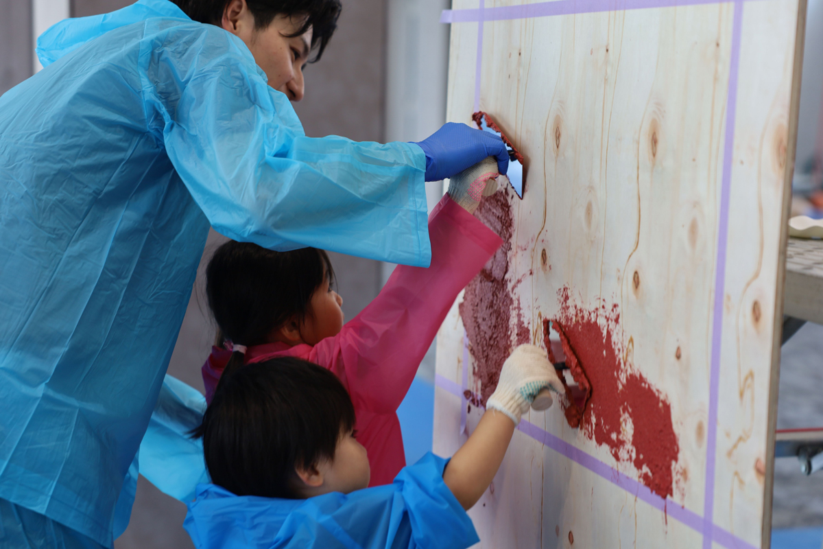 あわせて、職員およびご家族が参加する土壁ワークショップを実施。左官職人の指導のもと、参加者が実際にコテを用いて壁面を仕上げる工程を体験しました。初めての作業に戸惑う様子も見られましたが、作業が進むにつれ自然と熱中し、素材の扱いや仕上げの難しさ・面白さに触れる機会となりました。