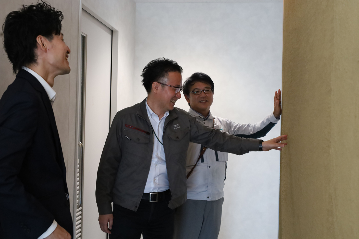 そうしたなかで、淺沼組さんから提案いただいた「土壁」は、お客様の相談をメインとしたこれからの店舗のあり方を考えるうえでも、非常にしっくりくるものでした。私たちが仕上げ材に土を取り入れるのは初めての取り組み。実際に名古屋支店を見学させていただいたことで、空間のイメージが明確になり、自然素材の柔らかさを感じました。また、ワークショップで社員の方が施工されたと伺い、私たちの方でも同様の体験を取り入れたいとお願いしました。自然素材である土を仕上げ材として活用し、その施工を職員や家族が手がけるというプロセスには、大きな魅力を感じました。