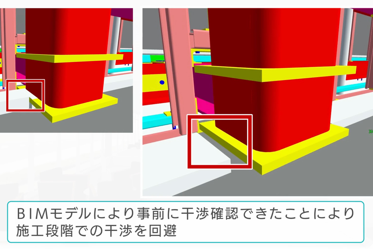 施工プロセスでは、BIM(ビルディング・インフォメーション・モデリング)を積極的に活用。たとえば、BIM上での事前検証によって、カーテンボックスと鉄骨柱のダイヤフラムが干渉していることが早期に判明し、設計段階での対応が可能となったことで、現場での手戻りを防ぎ、スムーズな施工につながりました。