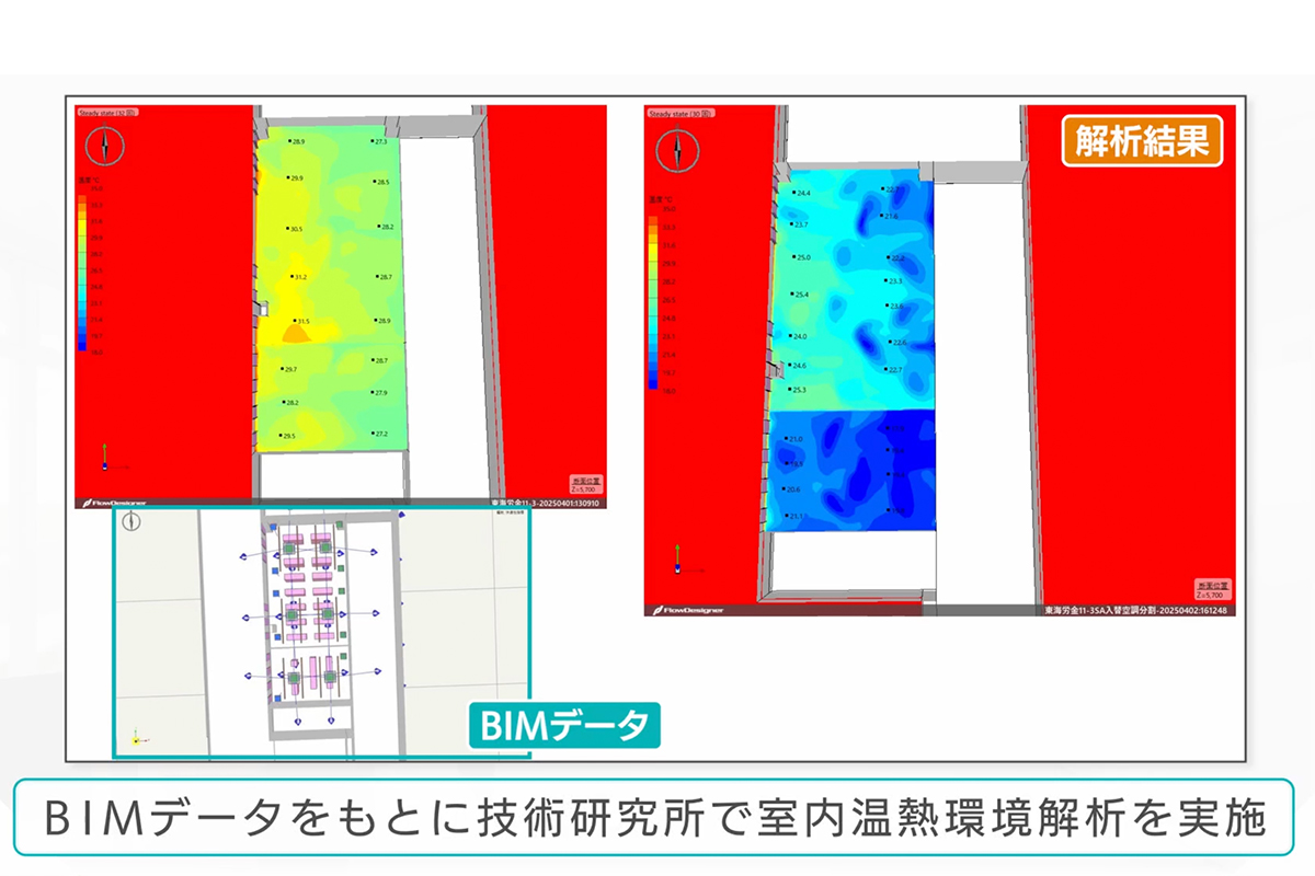 さらに、BIMデータをもとに技術研究所が室内温熱環境解析を実施。建物の環境性能を可視化し、最適な温熱環境の実現に向けた検証を行うことで、より快適な室内空間の提供を目指しました。