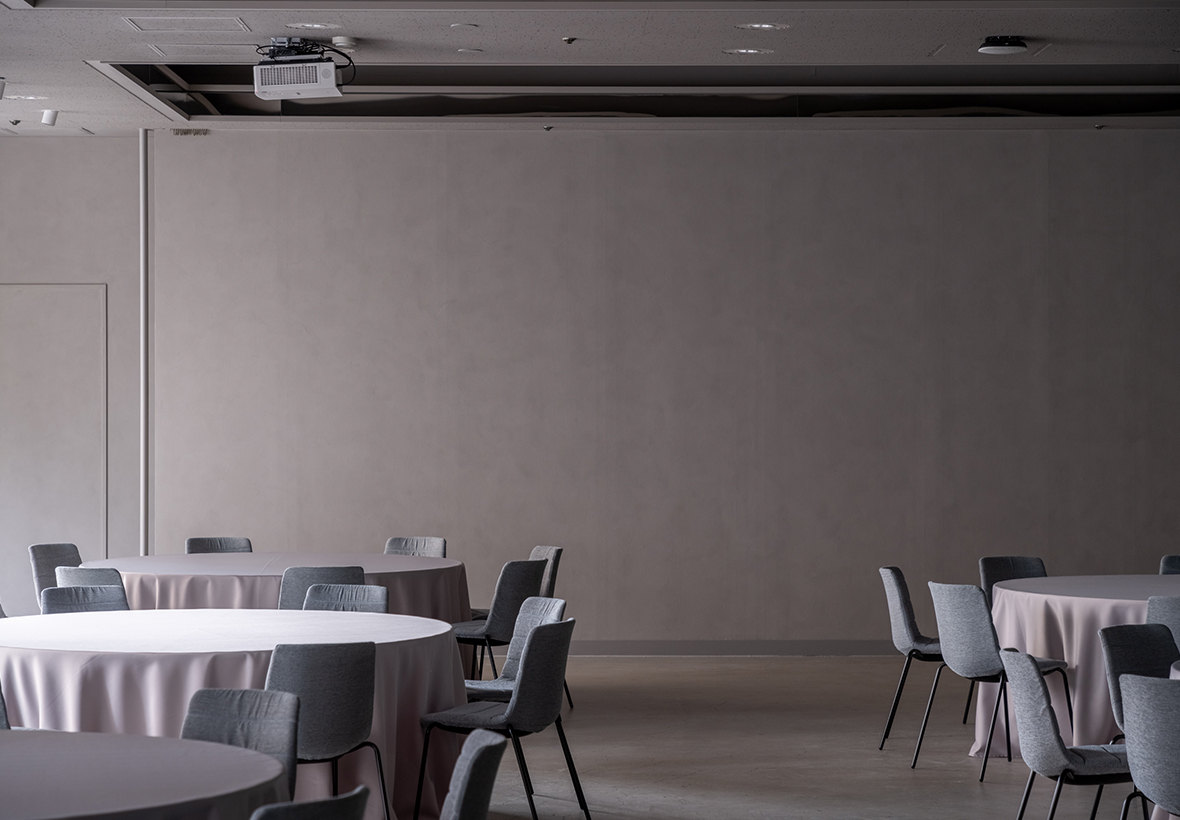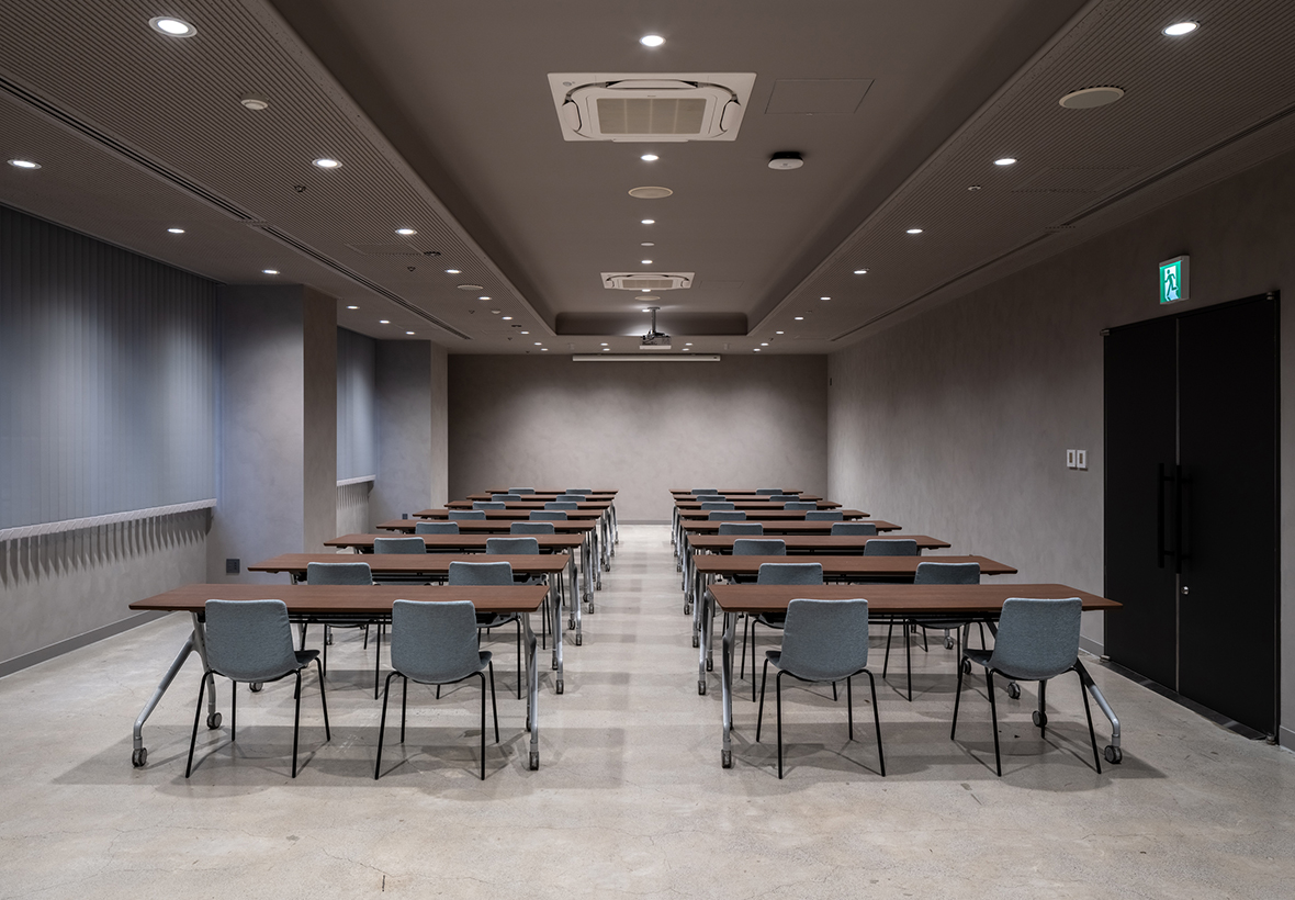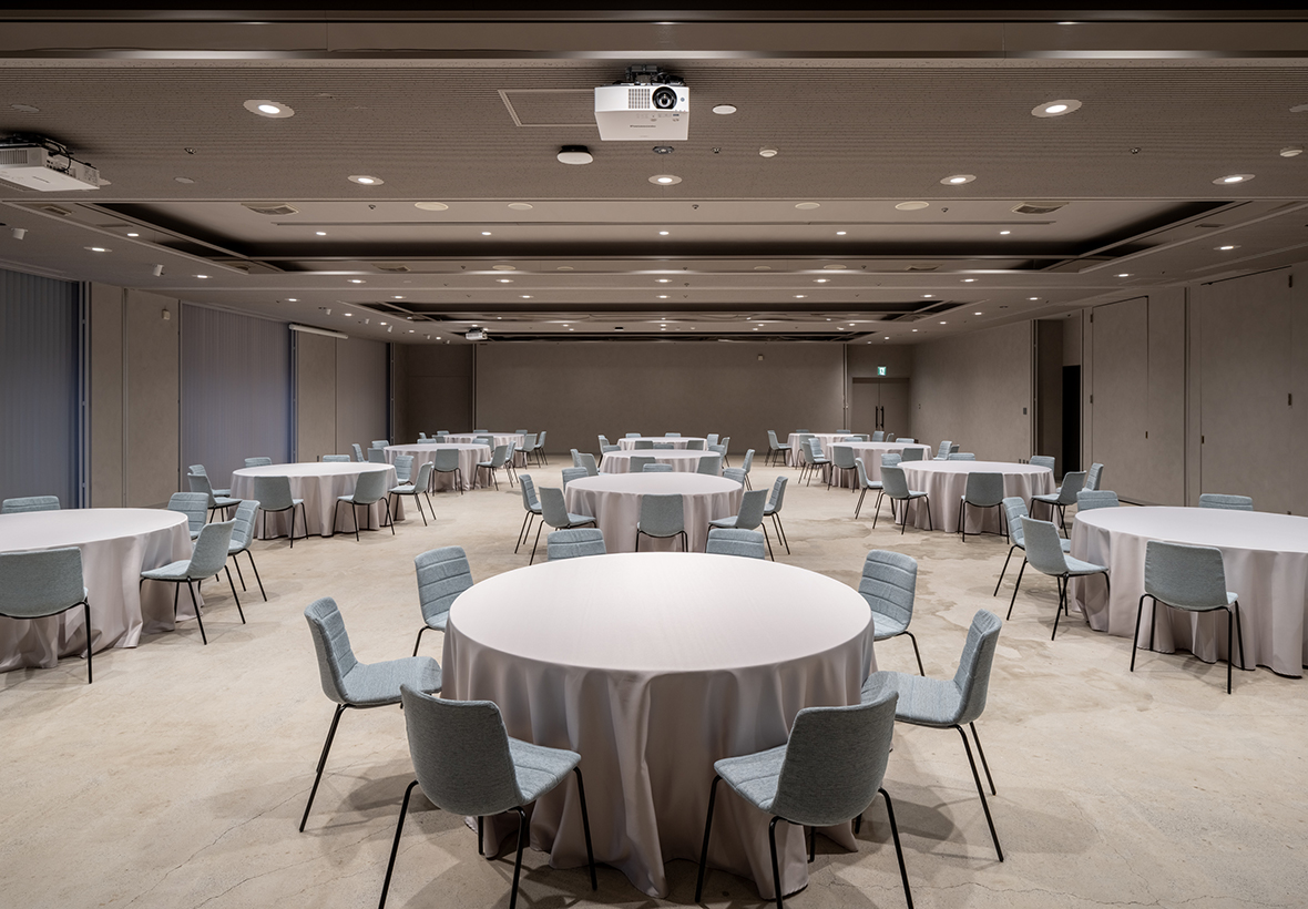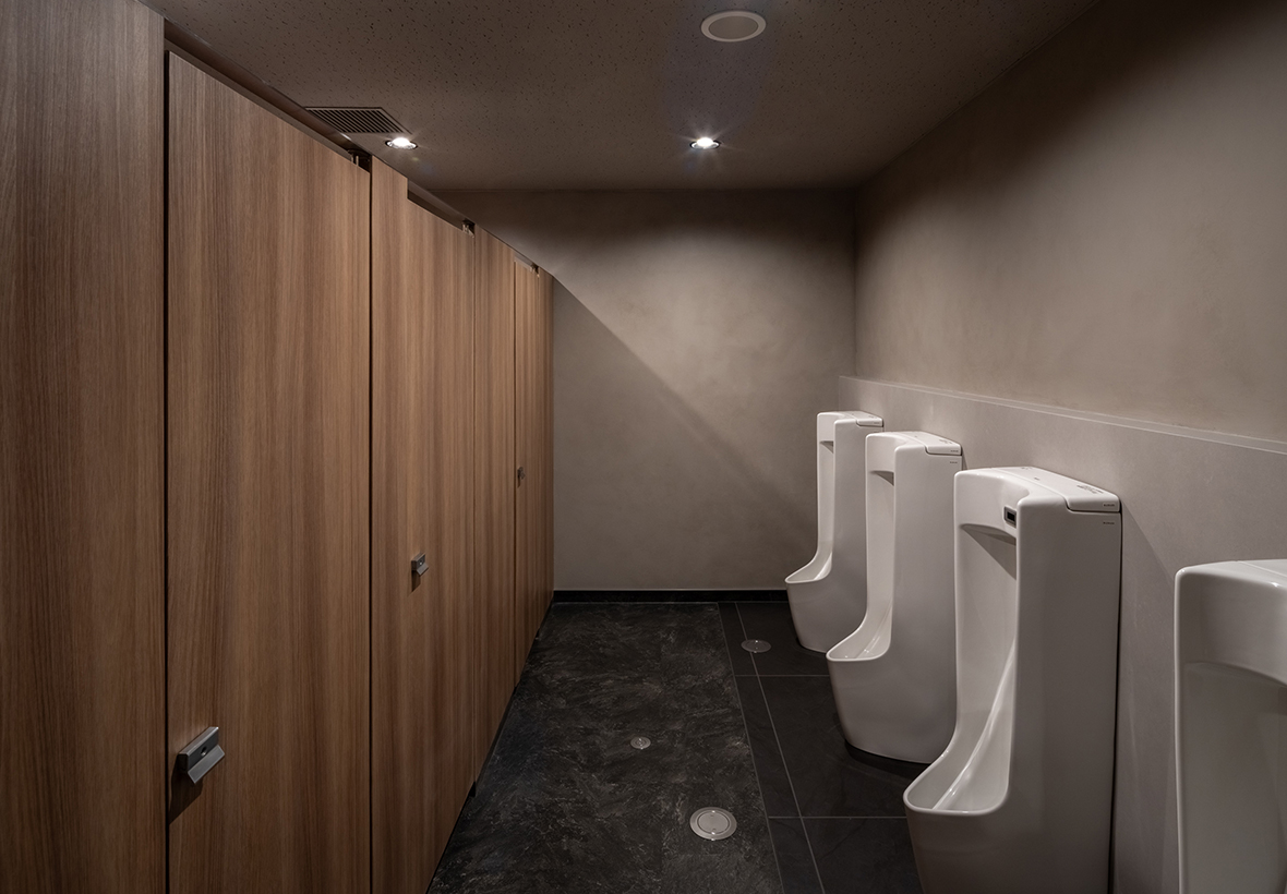 2階の大宴会場・会議室・ロビー(チェックインカウンター)・トイレでは、壁に「ソイル左官」を採用。ソイル左官とは、ドイツ製の天然塗料「ソイルペイント」に、関東圏で発生した建設発生土を再資源化した土と砂を混ぜた材料を用いた左官仕上げのことです。配合を調整しながら検討を重ね、ダークグレーを基調とした品のある落ち着いたトーンで空間全体をまとめています。